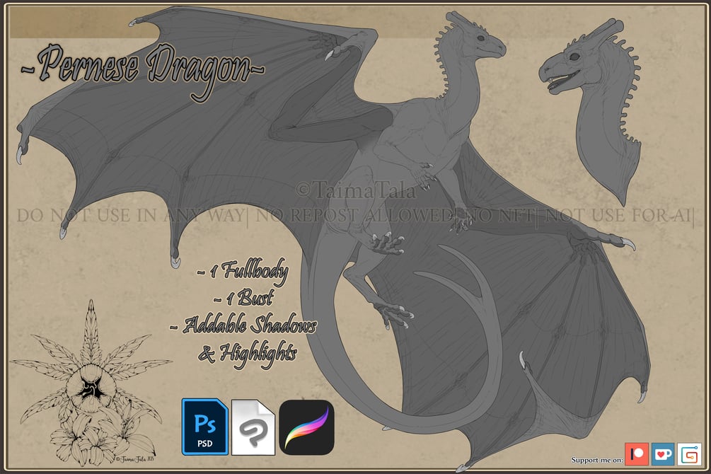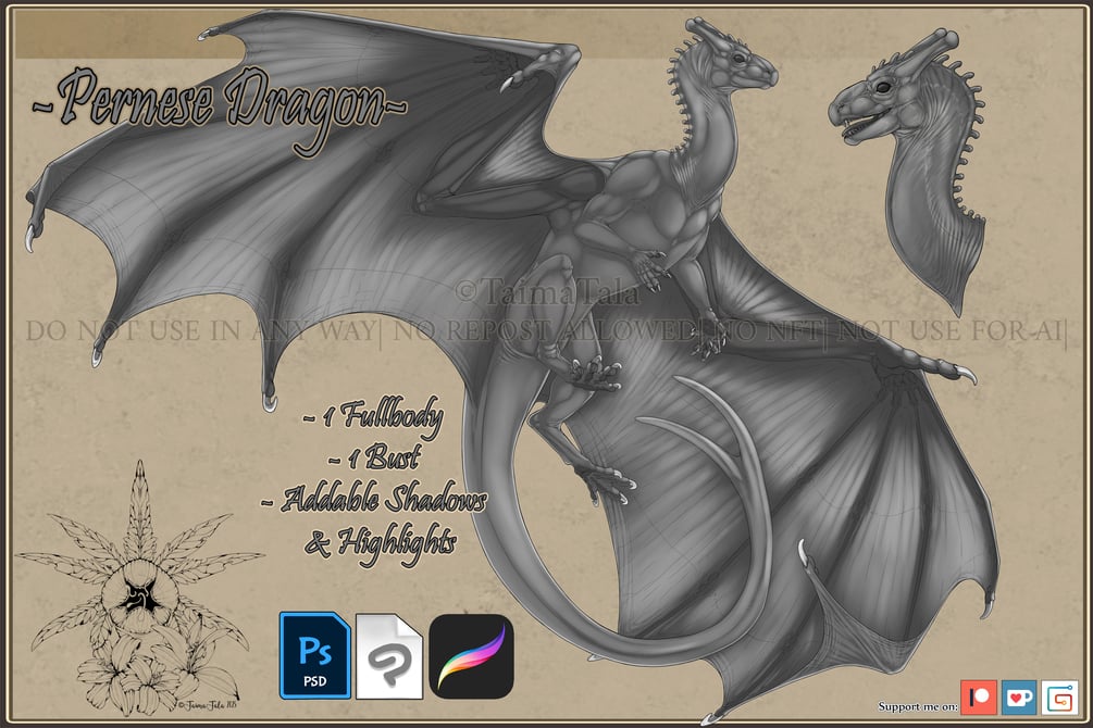 You will get a Fullbody Pern Dragon + Bust, with addable Shadows and Highlights